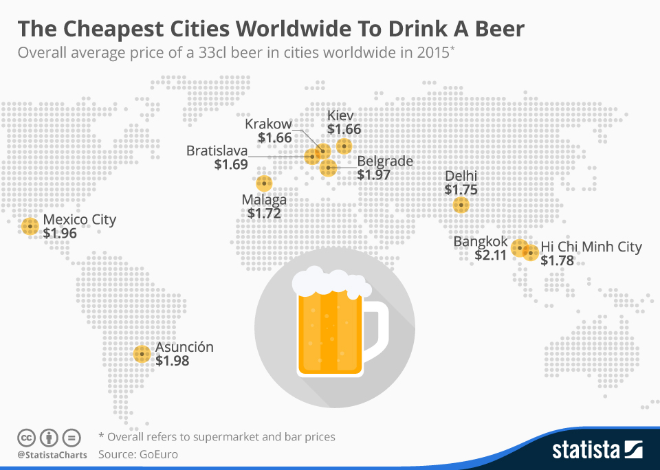 Beer, which accounts for three-fourths of the global alcohol market, is so universal that some economists have even used its cost ratio to compare real wages across national economies. Taking the UK as a baseline, one needs to work one half-hour at minimum wage to earn enough for a cold one. In the Republic of Georgia, it takes a minimum-wage labourer 30 times that to accumulate enough cash for a pint; Israel, Brazil, and Romania are 1:1 in terms of minimum-wage hours to beer purchases. (Note: For those cerevisaphiles willing to relocate, Puerto Rico is currently the cheapest place in the world for beer-drinkers.) However, such comparisons are distorted by pro- and anti-beer taxation policies. In the Czech Republic, the highest per capita nation in terms of beer-drinking, it has long been an informal rule of politics that any government that raises the price of beer will fall in a year, whereas in the Nordic countries, taxes are so high that one can rent a bicycle for less than the price of a decent draught.