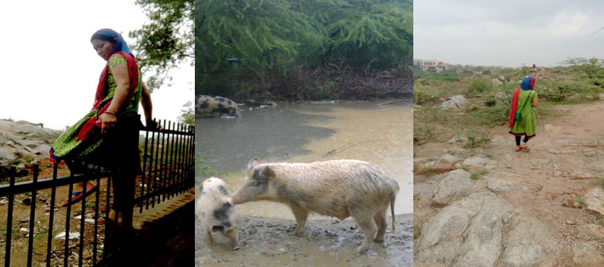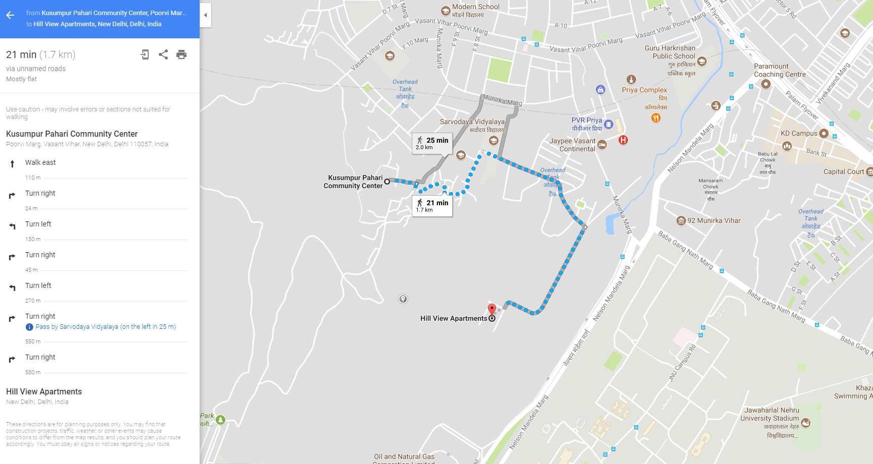 This is the daily walking route to work for Meera. Depending upon the route she takes, it can take her between 22 and 27 minutes to reach work. Given the household responsibilities, she chooses the shortest route. Google map cautions that the route ‘may involve errors or sections not suited for walking’ – the reason for this is that the shortest route involves both sectioned off areas and areas that are a health hazard.