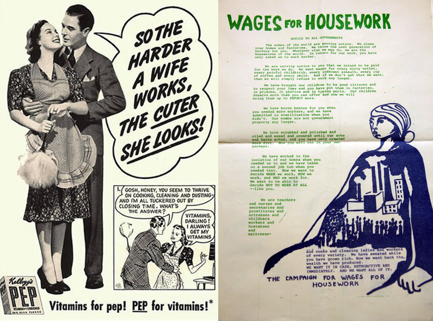 This unpaid work calculator was developed by the Office for National Statistics in the UK and is one way in which we might be able to calculate the monetary value of these kinds of activities. It is certainly worth trying it out and comparing your economic contribution with friends and family members. Feminist political economy asks that we look not only at the monetary value of housework (and other unpaid forms of work) but also at the social relations of housework – who does what and why – and consider how this work became gendered and valued less than other kinds of work. Taking this approach, scholars have argued that everyday activities such as housework are central to maintaining life and reproducing future generations and in that sense are intimately connected with the functioning of the capitalist economy.