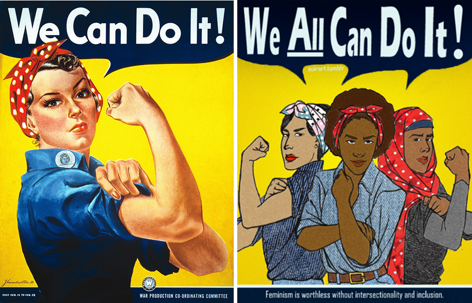 A 1942 war poster representing women working in factories and shipyards, and an intersectional riposte