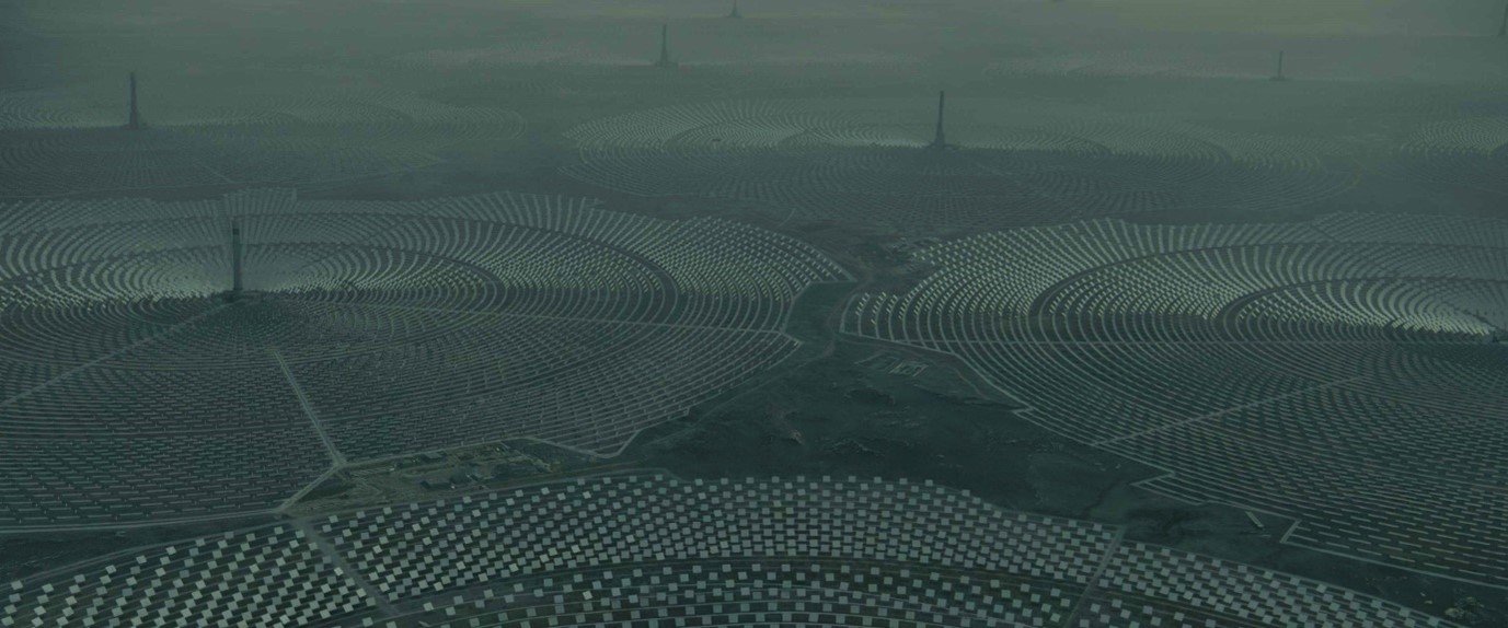 In the stunning opening scene of Denis Villanueve’s Blade Runner 2049, LAPD Officer K flies over the apocalyptic landscape of near-future California on his way to eliminate a rogue android. The camera pans over a barren expanse populated by Concentrated Solar Power (CSP) plants – concentric rings of mirrors that reflect sunlight onto a central tower, heating a liquid that in turn generates electricity. This actually existing technology was presumably chosen for the film because of its futuristic appearance and immense scale, with each plant resembling a colossal metallic crop circle.