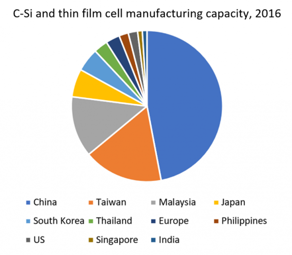 Unlike oil fields or coal mines, solar farms are generally located near energy users, because the costs of transmitting electricity over long distances are high. However, a solar farm’s components are relatively cheap to ship, and so component manufacturing is geographically mobile. Until recent decades, this production process was dominated by the US, Germany, and Japan. By investing in solar Research and Development, and providing generous subsidies, these nations jostled with one another to lead the world in solar panel production.