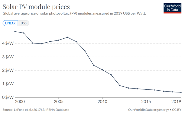 While individual manufacturers suffered, China’s entry into this market raised hopes that a green energy transition was within our grasp. As cheap Chinese c-Si panels flooded the market, the price of solar-generated electricity declined – falling by 82% from 2010-19 and undercutting even the cheapest coal-fired power plants. Overall, this phenomenon was heralded by many commentators as nothing short of a miracle. At last renewable energy was more affordable than fossil fuels. Perhaps the climate catastrophe could be avoided after all.
